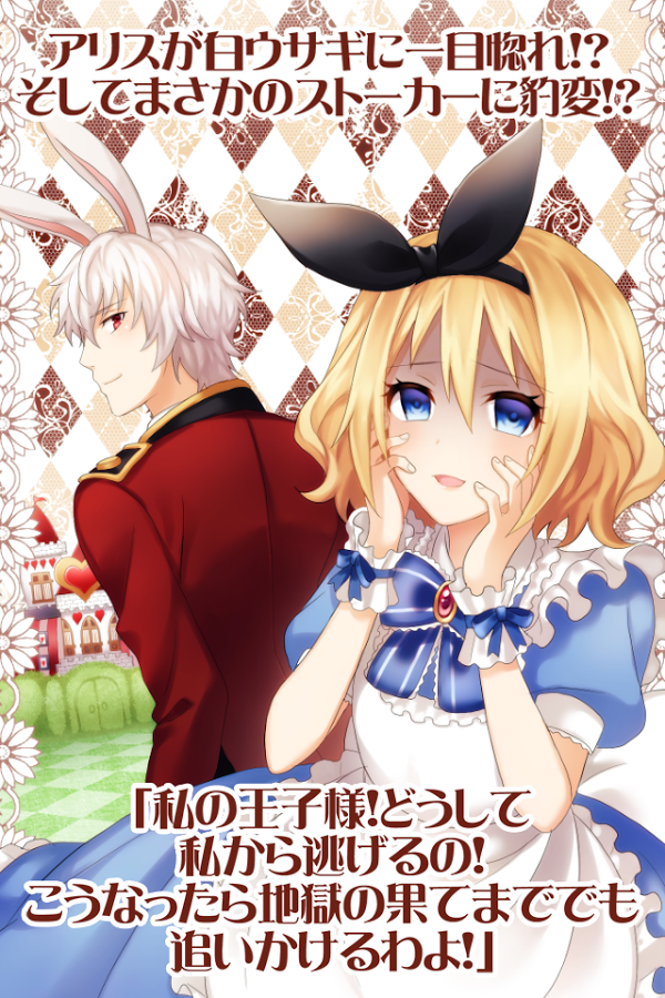 本作的背景是爱丽丝在森林中偶遇一只白兔子并一见钟情的故事,在爱情的路上超越各种各样的障碍,不久就慢慢变成狂气的跟踪狂,是一款充满黑幽默的新感觉故事型放置游戏。