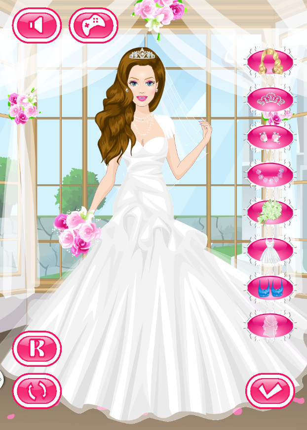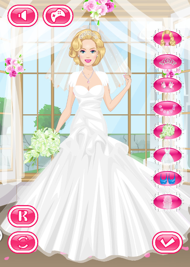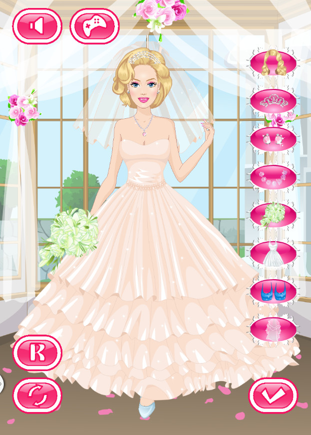 每个女人都想有一件漂亮的婚纱,在婚礼上绽放自己的美丽,该作可以让你为自己设计一件满意的婚纱,点击右边的按键可以为新娘搭配衣服和首饰,如果不满意还可以点击R键重来。游戏很有趣,适合女孩子玩!