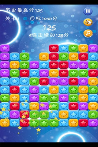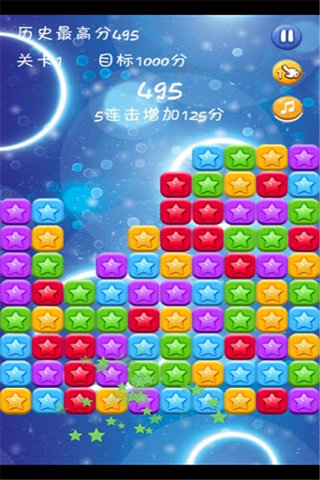 《休闲消星星》是一款趣味十足的消除星星玩法的手机游戏,给爱好经典消灭星星的玩家,留守最后一份乐土,消灭星星玩法介绍:达到目标分数即可过关,来看看你能通过多少关吧!如相连的星星大于2则可消除,相连数越多越好,最后如果剩余小于10则可以得到额外的加分。