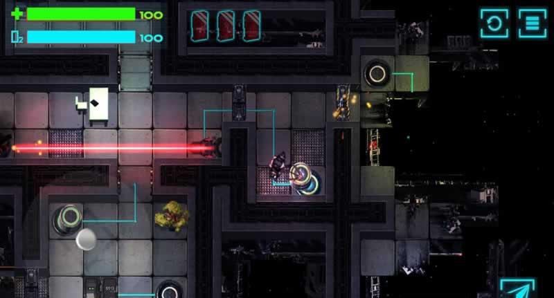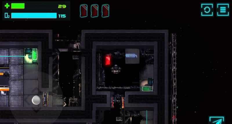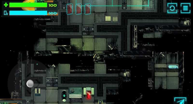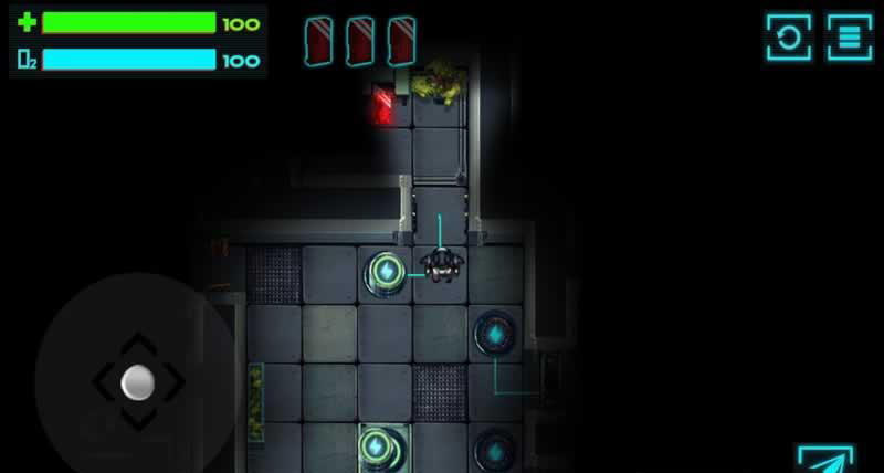 游戏以俯视角动作解谜为核心玩法,解谜的难度并不高,反而更为考验玩家的操控能力。屏幕左下方为方向虚拟按键,用以控制机器人的方向走动,点击屏幕右方任意区域,可以伸出机械爪来钩住可移动物品进行拖曳,或是抓住船舱等固定食物,加快自己的行走速度。