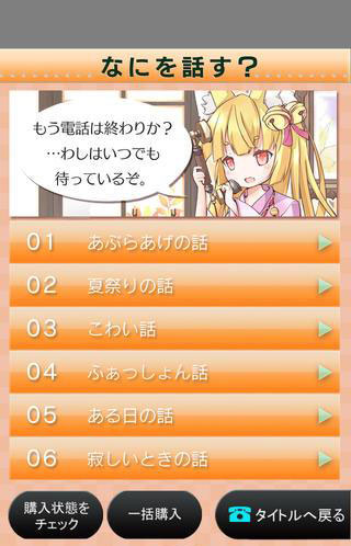《电爱~妖狐篇》是一款能像和真人通话一样,和游戏里的角色通话恋爱的游戏。是《电爱》系列声优出道计划第5弹作品!第六弹为《电爱~魔法美少女篇》点我进入