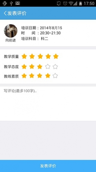 下载这款app后,学员可以直接通过手机对学车进行培训预约,取消预约和对教练进行评价等,让学员足不出户就可以第一时间掌握教练的详细信息和驾校的详细信息,简单又便捷,想要学车的亲们,赶快来下载吧!