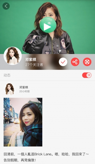 大咖台的内容包含视频(直播、点播、24小时轮播)、音频、图片、文字资讯、活动等多种形式。在明星专属个人电视台里,将24小时轮播该明星相关影视剧、综艺、音乐等视频作品;同时,粉丝可以一键订阅最心爱的明星大咖台,接收明星相关的全网消息推送——直播、点播,语音、图片、文字信息等,让粉丝第一时间获知明星全部动态。