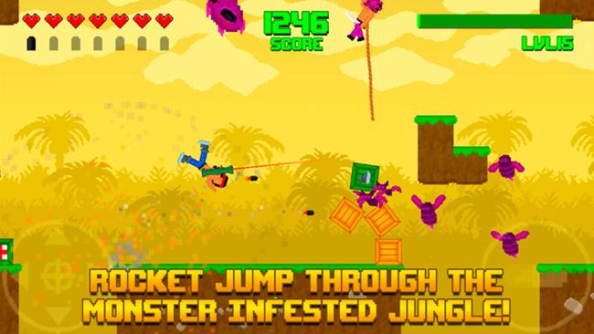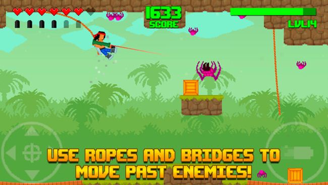 游戏里玩家作为一个被困在充满了怪物和陷阱的丛林里的战士,玩家要使用机关枪消灭沿途出现的敌人,包括各种野兽和昆虫。玩家可以使用虚拟摇杆控制角色移动,并用按键操作角色射击,还可以使用绳索帮助自己在空中移动。当然玩家还可以收集物品来增加战斗力。