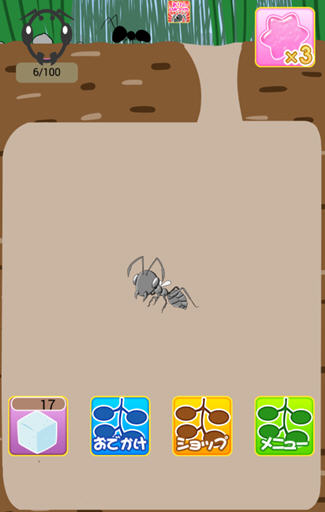 游戏的日文可以翻译成两种,基本意思依然是蚂蚁养成,与它的玩法一样。有没有想过有一天会饲养蚂蚁呢?操作很简单,就是通过点击屏幕跟随游戏要求去收集,首选当然是选择你的宠物了,再就是为它寻找食物,养成的状态一直是个惊喜。