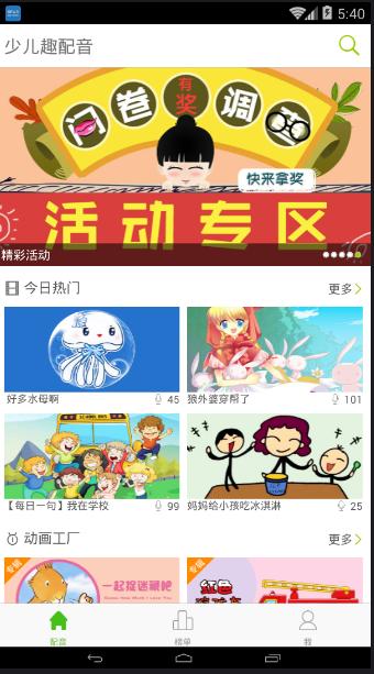 《少儿趣配音app》是一款通过给动画片配音的方式练习英语口语的App。通过UGC频道整合最经典最新潮的动漫、英文儿歌、经典教材等视频,打造最全的少儿视频类外语口语学习系统,让孩子们在玩转配音的同时,不知不觉提高英语口语水平。