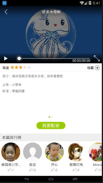 非常棒的寓教于乐式口语练习软件,主要是用来练习英语口语的,当然用来练习普通话也是可以的,甚至就可以当作一个游戏,挑战自己喜欢的动画片,喜欢的动漫人物,扮演他们为他们配音,也是不错的玩法!