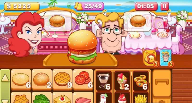 游戏属于比较传统的时间管理类玩法,玩家需要在预先设计好的关卡进行挑战,根据顾客的不同需求制作不同的美味汉堡,收集金币来购买更多的制作工具。