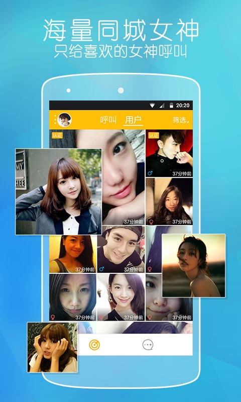女神:任何时候都可发起呼叫,不管是无聊、心情不好,还是想约人出去吃饭,喜欢你的男生会立即回应。未经过你挑选,没有人能给你发信息,避免骚扰。