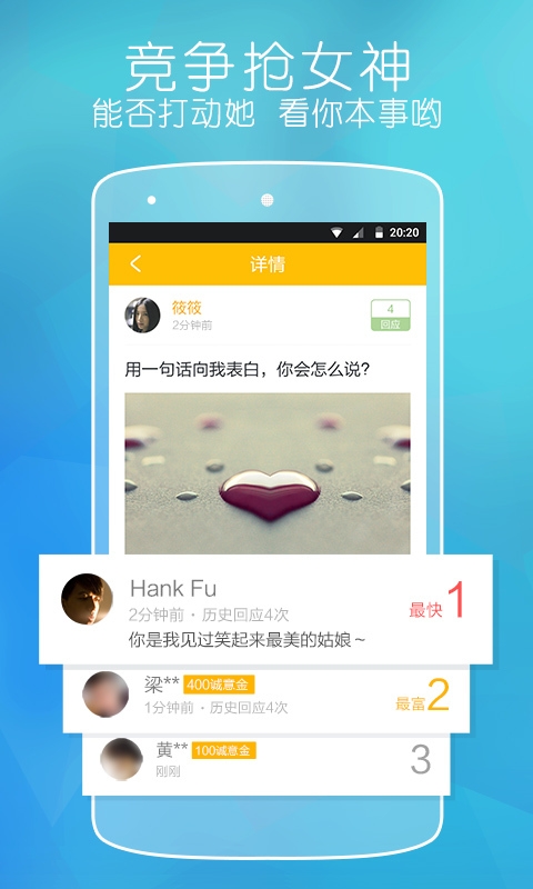 竞争抢女神,男生可通过回应的速度、内容、诚意金,竞争抢女神的关注,刺激好玩。
