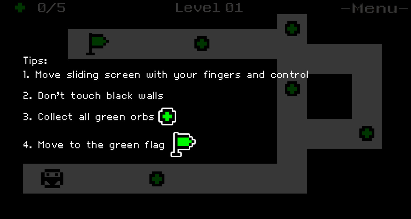 进入游戏选择想要挑战的关卡,滑动屏幕可以控制像素人移动,每个关卡都需要吃到固定的绿点,当你吃完绿点移动到绿色旗子旁时通关,注意不要碰到墙壁,碰到就over了,很考验玩家的操作能力!