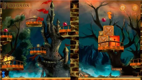 《双生灵魂》这款游戏充满了奇幻色彩,所谓冒险游戏也带来了丰富的解谜体验,实际游戏中玩家要通过虚拟按键进行操作,并且需要同步控制屏幕左右两端的小男孩进行方向走动与跳跃动作,最终目的要收集魔法球,并将两个灵魂归于各自区域内的大门。两个灵魂所在的区域均有各自的独立陈设,大家要解开各种谜题,才能找到并打开通关大门。