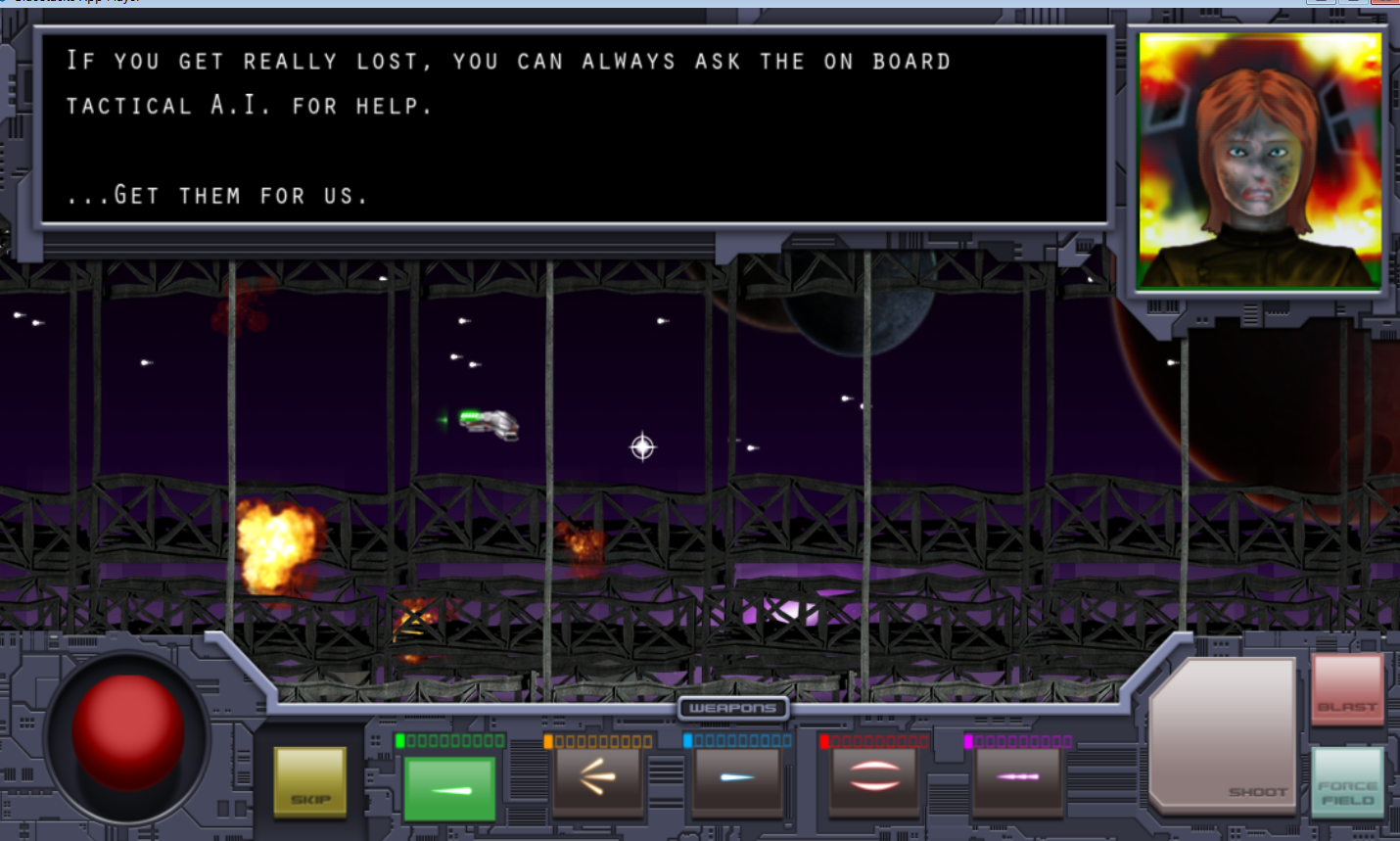 能量启动模拟飞行游戏,玩家们负责为太空另一端传递军事物资,在传送的过程中会有陨石敌方战机的袭击,玩家们要控制好你的能量躲避他们,游戏以虚拟摇杆加按钮控制方向,穿梭于敌机和陨石之间。