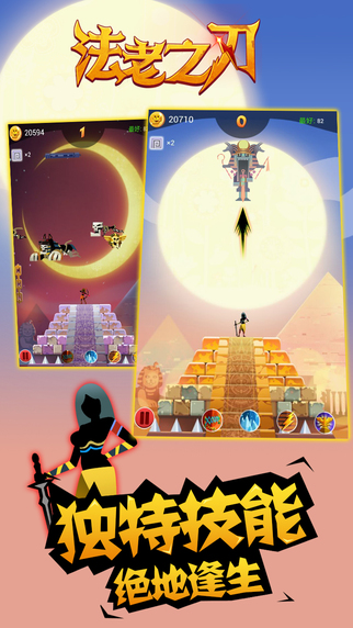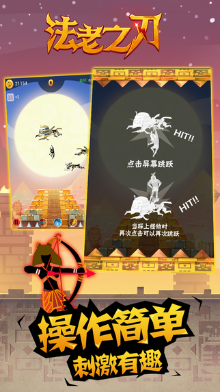 《法老之刃》是一款休闲跳跃游戏,玩家需要做的就是点击屏幕任意位置控制角色跳跃,用头顶或者用脚踩消灭怪物,消灭一定数量的怪物后会出现BOSS,BOSS则需要玩家踩怪进行二次跳跃来消灭。