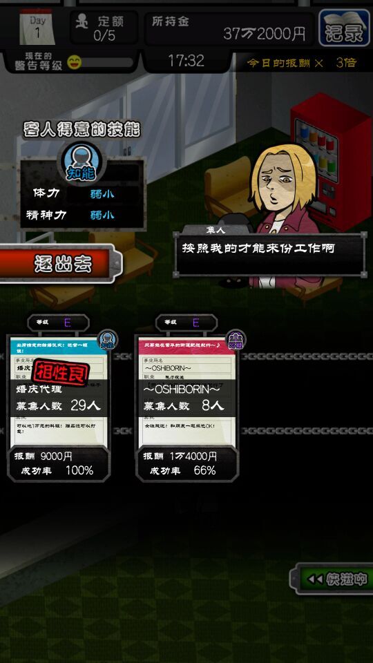 游戏的一开始,主角感到无比的累觉不爱,所以不想干了,就向老板提出辞职,可是老板说辞职可以,但是要赔偿 10 亿日元,于是主角便走上了黑中介的道路