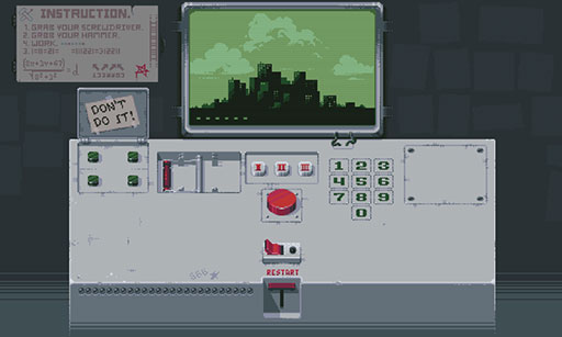 游戏中,玩家要为一名去上厕所的同事代班,他对你千叮咛万嘱咐,不能碰周围任何东西,而事实是,你的周围除了一个神秘面板和红色按钮外也的确没有其他东西可以碰了。