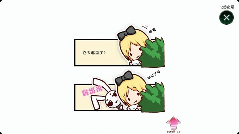 点击开始游戏后首先是漫画风格的OP,向上滑动可以翻页查看,OP使用了类似4格漫画的形式,某一天爱丽丝正在喝红茶,结果出现了一只穿衣服的兔子,好奇的爱丽丝本想上前打招呼,但是兔子突然偷走了爱丽丝重要的茶杯,于是爱丽丝追着兔子来到了幻想之国...这样的轻松剧情配上4格漫画真是太适合了。