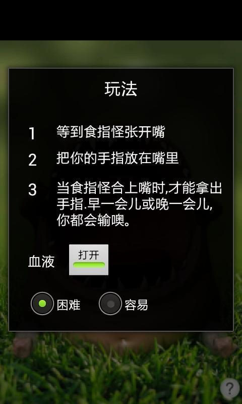 食指忍者是一款玩法简单却十分刺激的休闲手游,游戏中玩家将面对一只可爱的小怪物,他会张开大大的嘴巴找你要吃的,你需要把手指放在他的嘴里,在他合拢的一瞬间拿出来,不然你的手指就会被吃掉哦!