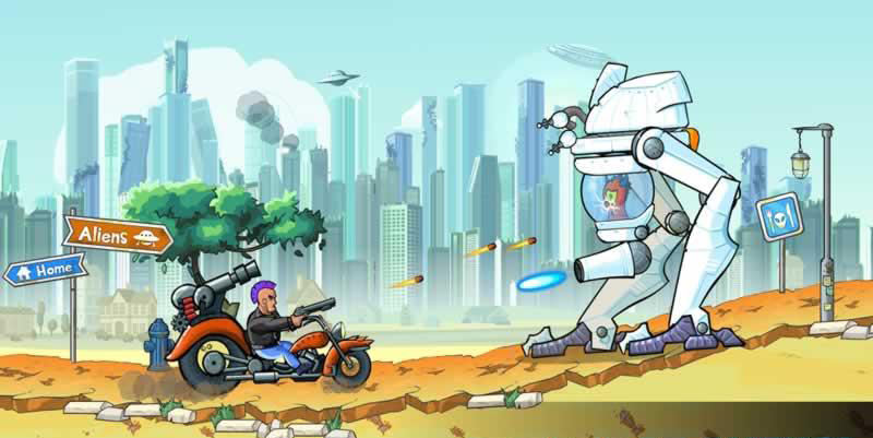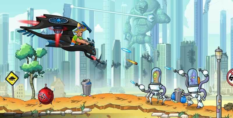 疯狂的一天是一款横版动作射击手游,游戏有着非常恶搞的剧情背景,你将为了拯救自己的宠物章鱼而与外星人作战,于是奇葩的冒险就这么展开了,游戏有着非常丰富的武器和载具选择,你通过消灭外星人获得资源来购买它们。