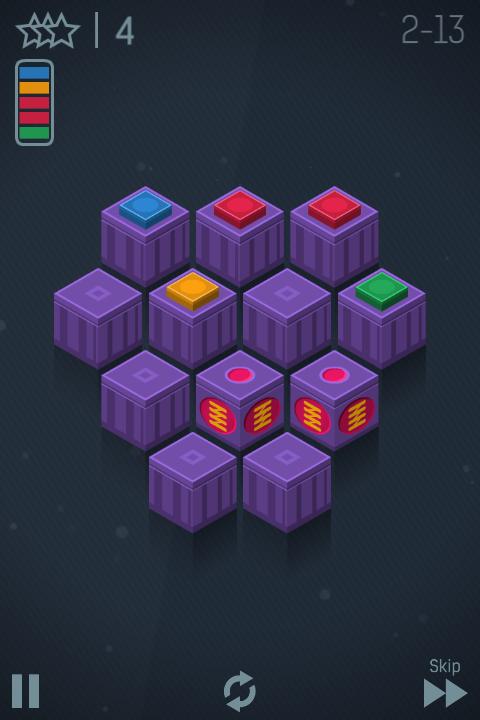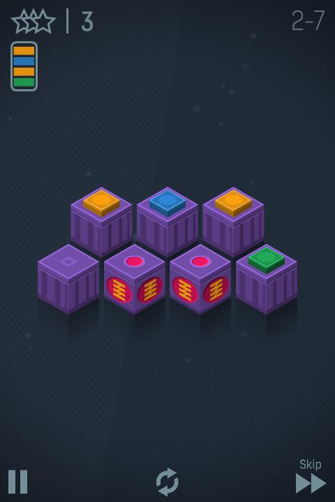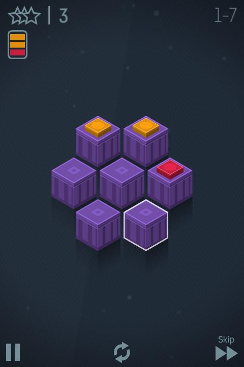 最终的效果图显示在每关的左上角,游戏前十关是详尽的教学,很有创意,也很费脑享受这个令人上瘾的益智游戏,将彩色芯片堆叠起来,用最少的步数赢得更多的星星!