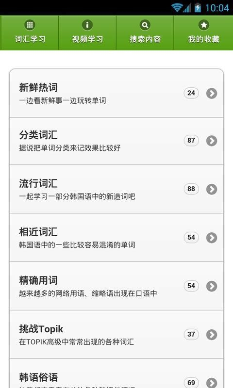 韩语背单词是一款学习韩语专用的汉语词汇软件,从零基础开始学韩语就可以用,从最常见的词汇开始背起,在韩语中生化,再上一些小课堂,韩语就是迅速学起!但是首先要做的就是背单词!