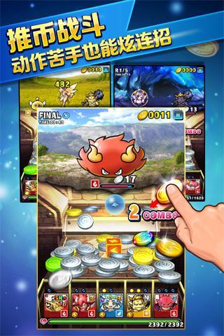 《金币斗恶龙》是日本SEGA公司在移动平台上推出的一款以推币机为主题玩法的卡牌RPG游戏,玩家在游戏中使用硬币进行战斗,并在冒险途中收集种类繁多的怪物,甚至还有机会和基友组队推倒传说中的恶龙!