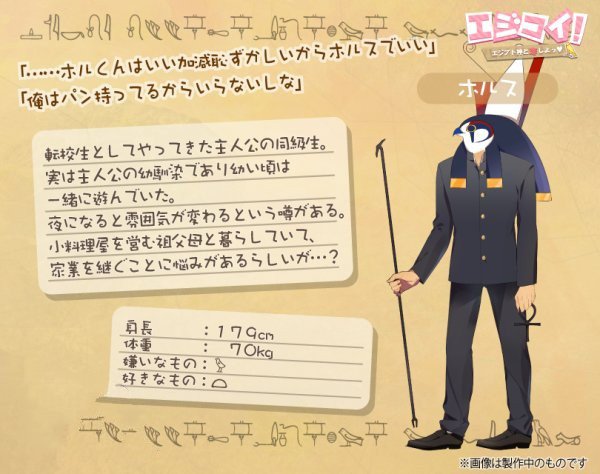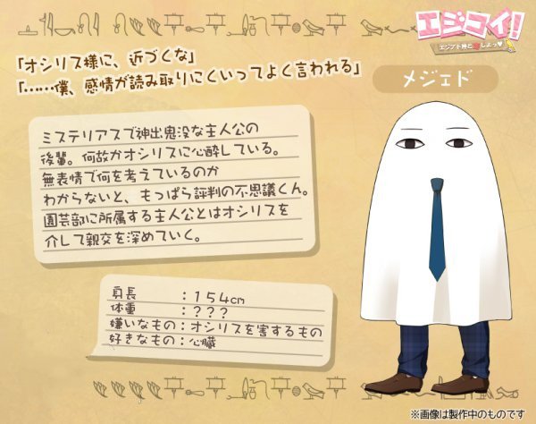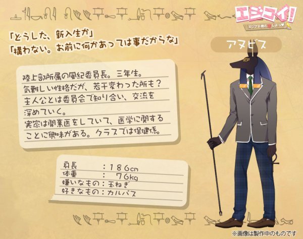 本作中作为女主的玩家将会和三位埃及的神明恋爱!他们分别是神秘的梅杰德、狗头神阿努比斯、隼头神荷鲁斯。这些神袛在设计上都非常有意思,作为乙女游戏居然没有帅哥!(当然也说不定面具下面很帅呢?)