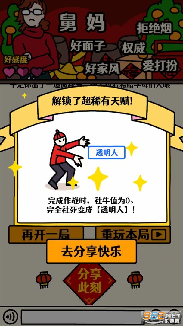 一款非常有趣和富有挑战性的休闲小游戏。游戏以轻松愉快的沙雕风格为特点,让玩家在享受游戏乐趣的同时,也能感受到节日的温馨和亲情的力量。游戏中的亲戚角色丰富多样,每个亲戚都有独特的性格和喜好,让玩家需要根据亲戚的特点进行针对性的攻略。