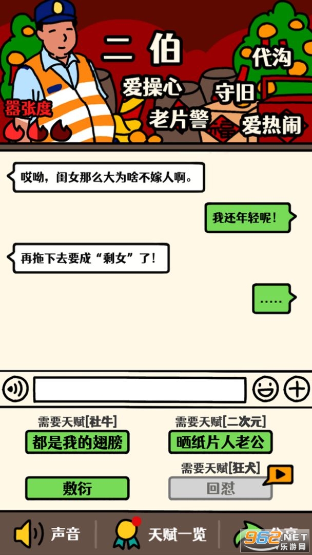 《走亲戚大作战》是一款以轻松愉快的沙雕风格打造的休闲小游戏。玩家在游戏中将模拟逢年过节与亲戚们的对话互动,通过简单的点击选项,将那些令人头疼的亲戚们的“死亡聊天”怼回去,享受一个完美的节日体验。游戏不仅提供了丰富的剧情选择,还有多种性别和职业供玩家选择,让每一次的亲戚互动都充满新鲜感和挑战性。