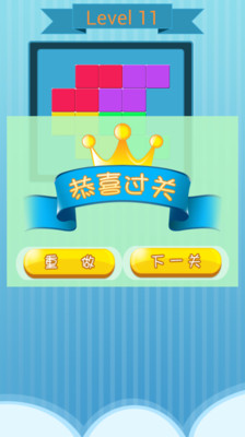 你需要运用你的想像力,把下方不同颜色的积木,填充到上方的指定区间里,积木是不能旋转的,当把上方的区间填满后,则过关。