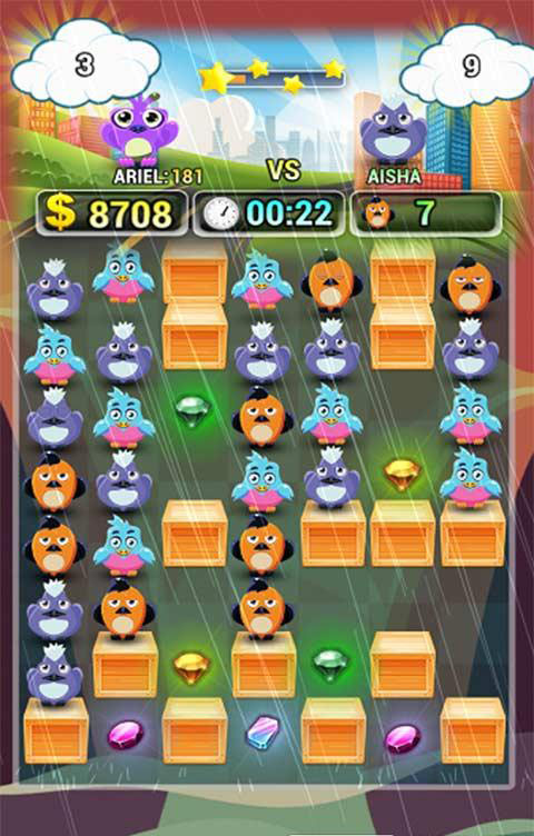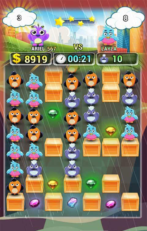 《炸弹鸟》是一款很经典的消除游戏,游戏可爱清新的画面,轻松有趣的背景音乐,活泼可爱的游戏主角,可爱的小鸟们陪你度过无数的闲暇时间。3个相同颜色的小鸟连在一起便可消除,看似简单的游戏经过精心巧妙的设计后,让人玩起来趣味无穷。
