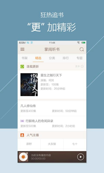 畅销小说、百家讲坛、郭德纲相声、名家评书、少儿读物……多达26种分类的海量高品质作品集你所需,同时拥有专业的更新团队保持极速更新,即刻开启你的听书盛宴!