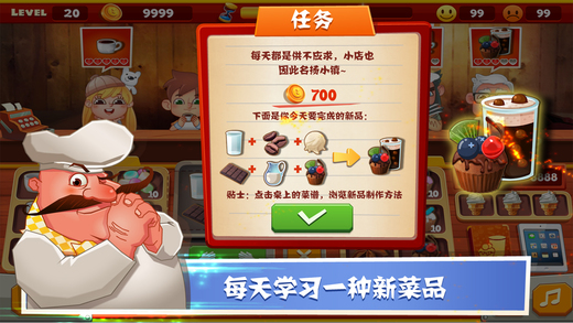 顾客络绎不绝地来到你所经营的咖啡馆,点选各种不同的咖啡,你要尽最快的速度把顾客所点的咖啡和点心制作好。同时一定要记住每种咖啡的制作顺序,如果把原料的顺序放错了就会制作失败了,非常有挑战性! 还能通过升级和装饰来提升你的制作速度和服务质量哦,还等什么呢,快来经营你自己的咖啡馆吧!