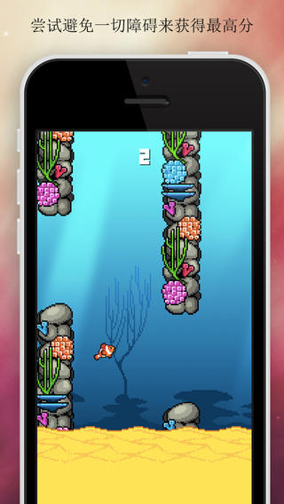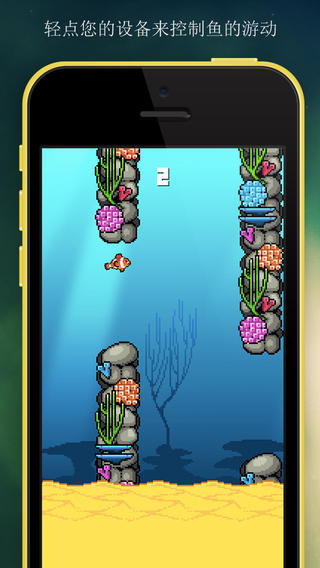 简单到爆的的操作方式—点屏幕。游戏的困难所在—点屏幕。是的,成也是它,败也是它,游戏的可玩性就全在于玩家对飞鱼跳跃的操控性了。通过点击屏幕来使飞鱼向上跳跃,不至于坠落倒地。而想要安全穿过柱子,就需要玩家计算好起跳时机了。不过小鱼的动作幅度实在有些大,一不小心就会撞到柱子,气得小编直吐血啊。