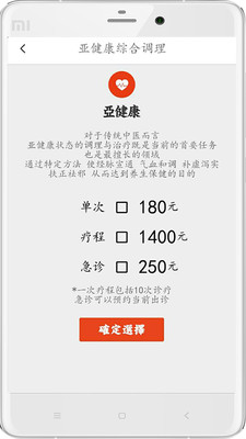 主要包括(亚健康、脊椎健康、美容减肥、妇婴调理、运动康复、疑难杂症、名医堂、团体诊疗)8个类目。