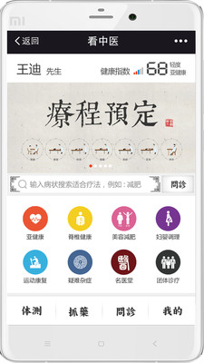 看中医是国内第一家中医出诊的产品,通过挂号(用户预约)、诊疗(望闻问切)、医嘱(后续体质跟踪)等方面对用户进行出诊服务。