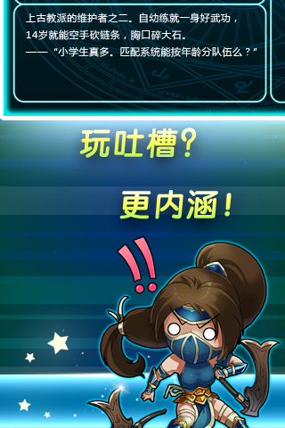 《撸你妹》手机网游根据当下最火爆的竞技网游英雄联盟改编,采用LOL题材战斗场景斜54°∠地图,俯视角度卡牌战斗、精美CG画面,主界面为用场景替代菜单。超过200多种炫目技能特效、每个英雄都完美呈现LOL中独有技能。