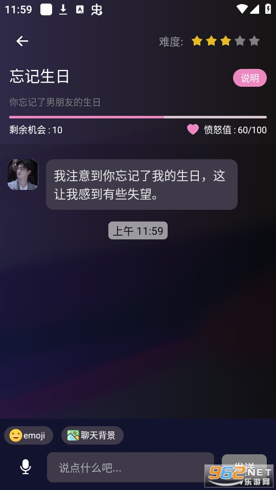 你需要利用自己的语言能力和沟通能力,在有限的次数内将对方的愤怒值降低到20以下。