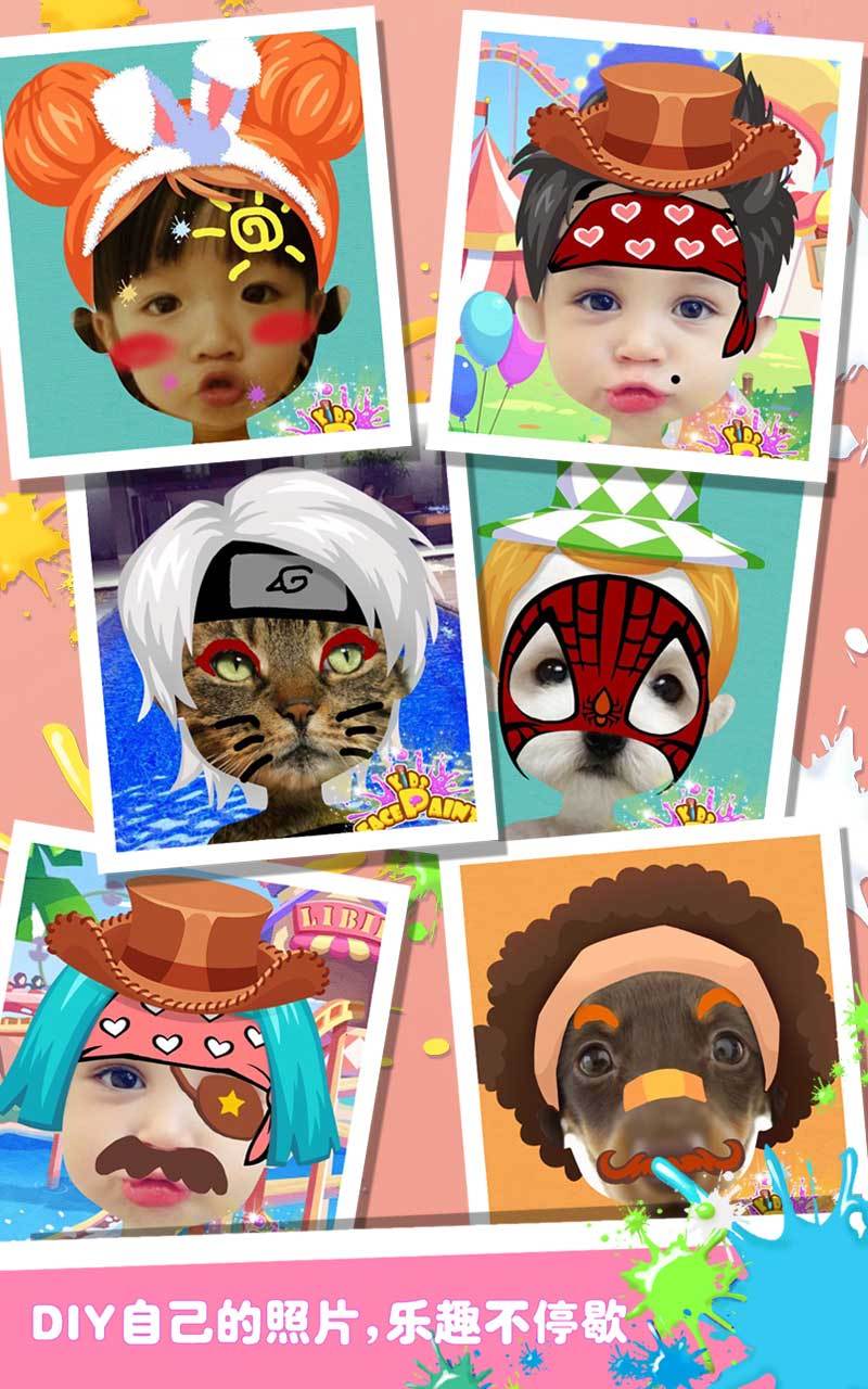快乐儿童脸绘是一款充满了童趣的创意休闲小游戏,你可以将自己的脸,你家小朋友的脸,或者游戏中自带的儿童头像作为原图,加入可爱的动物彩绘加工,将头像做成萌萌哒小动物,或者很逗比的小怪物,一切在于你的爱好与创作哦!