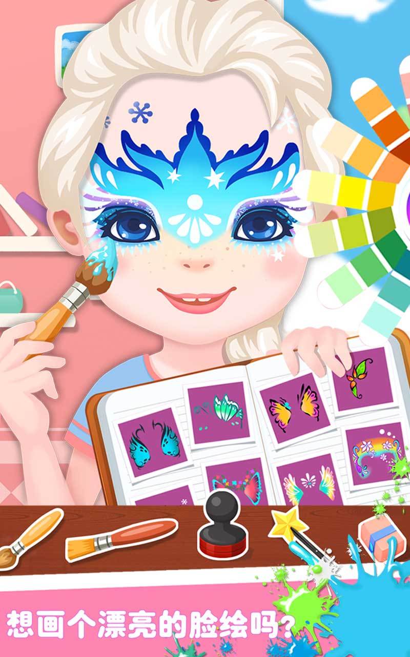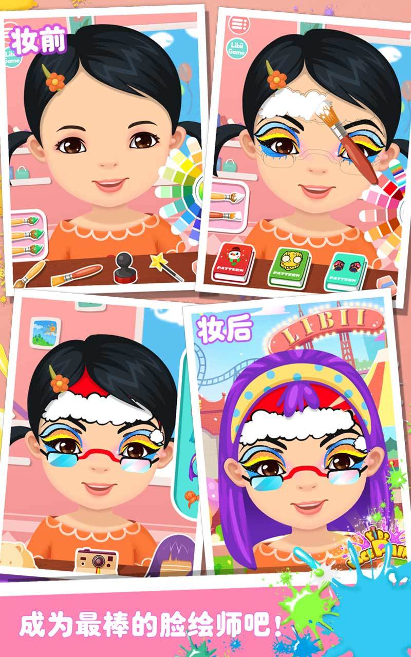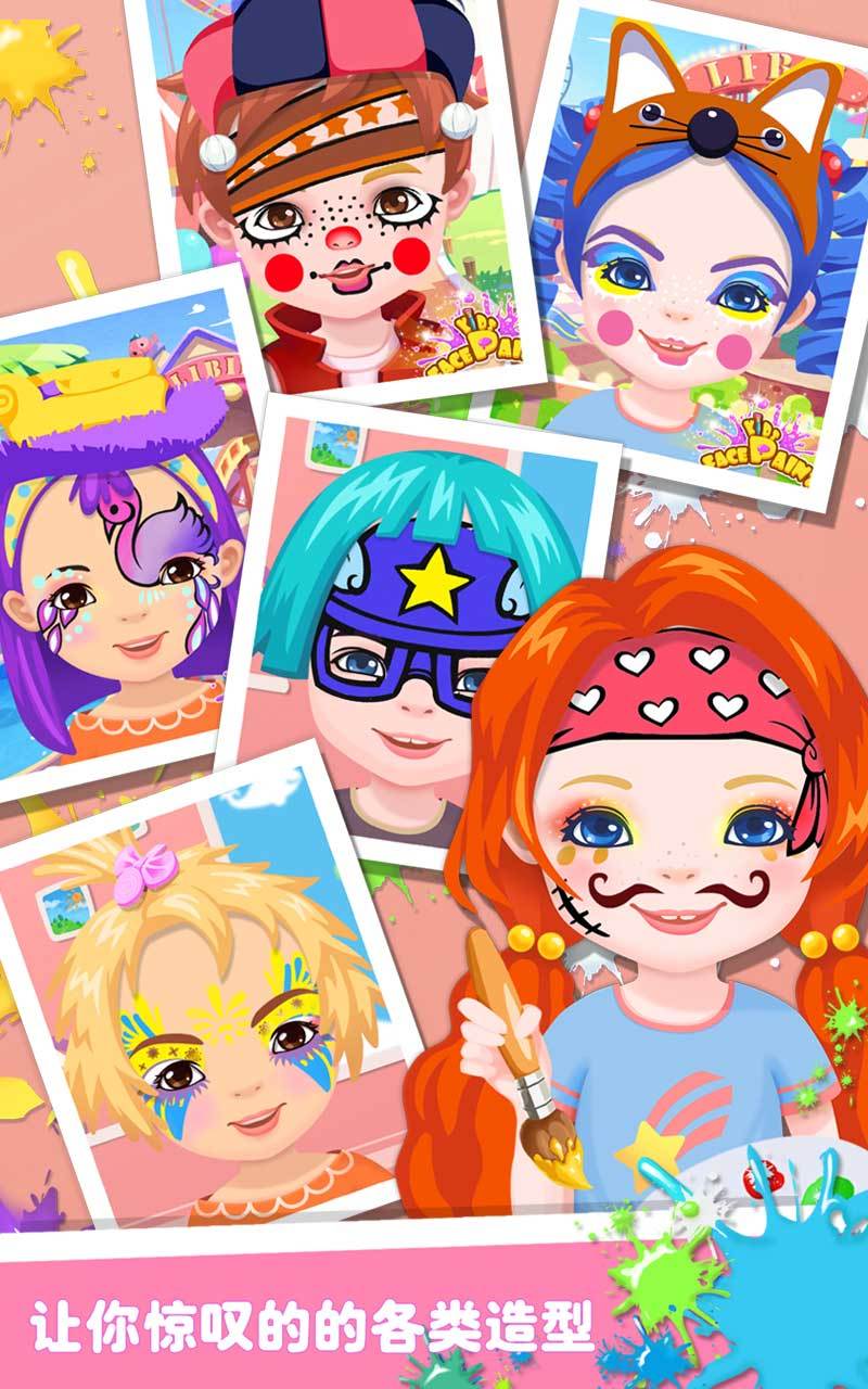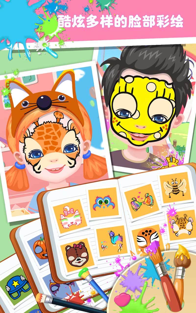进入奇妙的彩绘世界。首先,从6个萌萌哒的小朋友中选择一个模特或者点击相机图形上传自己的照片,然后开始展示你的艺术天赋吧。屏幕下方有多种系列图案可供选择:老虎、蝴蝶、小丑…首先点击图册,在众多图案中选取满意的图案。嗯,到了你挥动笔刷尽情创造的时候了。点击画笔,颜料盘随之展开,点击不同的色彩对脸上的图案进行涂抹。海天蓝、高贵紫、抹茶绿……释放你的艺术灵感,为美美的图案配上惊艳的色彩吧。如果涂错也没关系哦,点击橡皮擦消除即可。要知道,创作完成后还可以选取发饰装扮模特哟。哇哦,大功告成了,是不是成就感爆棚呢?记得点击屏幕下方的照相机拍照留念哦。小伙伴们,一起来为平淡的生活上点颜色吧。