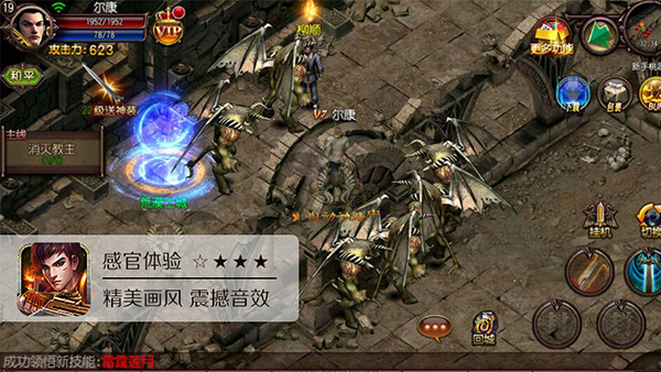 游戏操作上,作为一款传奇PK类手游,操作自然不会繁琐。左侧以虚拟按键控制人物移动,点按为攻击和释放必杀技。游戏界面清晰明了。挂机、骑乘、回城、背包、副本等直接显示在第一级画面,方便玩家即时点按。触发角色技能时,会有技能名称显示,加上炫酷的技能特效,操作感及打击感都显得相当顺畅。