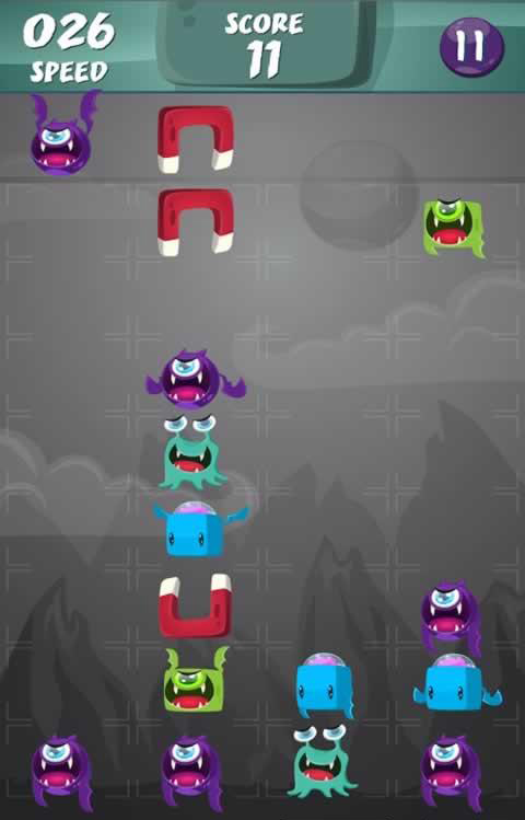 《怪物粉碎机 Monster Crusher》是一款以各种怪物为主题的消除类休闲娱乐游戏。游戏玩法很简单,只需要两只相同的怪物放置在同一垂直线上即可消除。当然除了怪物,上方还会随机掉落磁铁,被磁铁吸住的怪物会直接被消除!