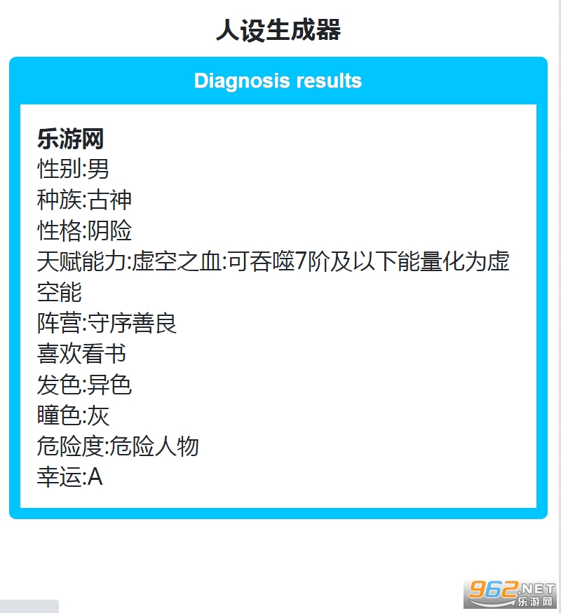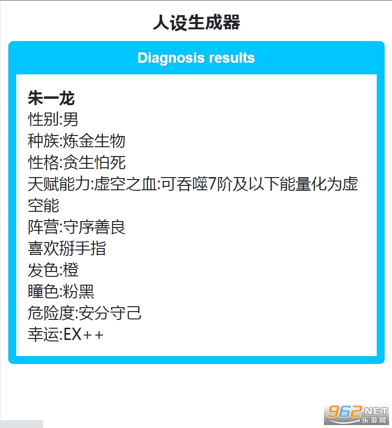 《ionicapp》是一款超级好玩的随机生成小游戏,能够为大家一键生成各种各样的人设,操作简单,只需要输入你需要的生成的人设名字,点击生成,就可以看到该名字性别,种族,性格,天赋能力,阵营,爱好,发色,瞳色,危险度,幸运度等等,看看他的人设是什么样子的!