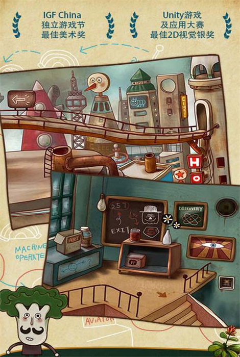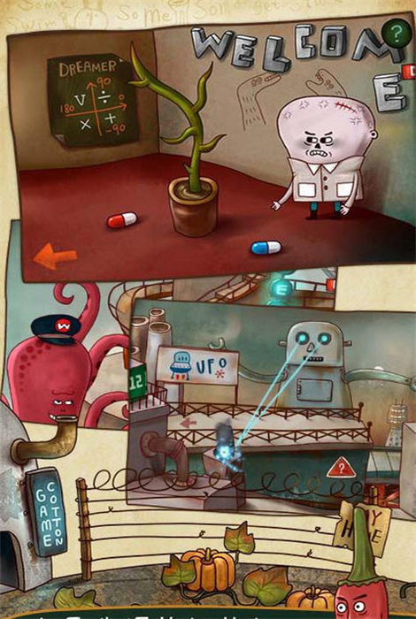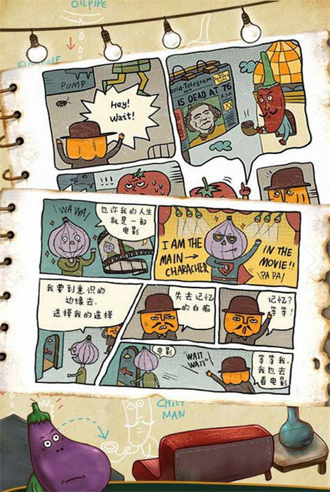 带着两撇小胡子的南瓜先生,随着他的历险,勾勒出了一个荒诞的蔬菜王国世界。随处可见的一些小谜题或者提示,都可以看出制作人的匠心独运,这个荒诞的世界的秘密,等着玩家去细细发掘
