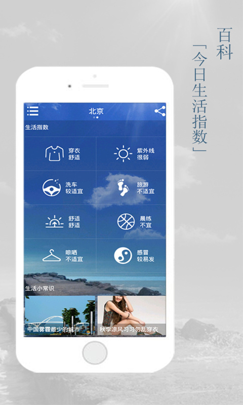 空气质量、污染指数、温度趋势、pm2.5等更加丰富、精准天气信息!提供穿衣、洗车、紫外线、感冒、运动、旅游等生活指数,是您日常生活、出行旅游的必备APP!
