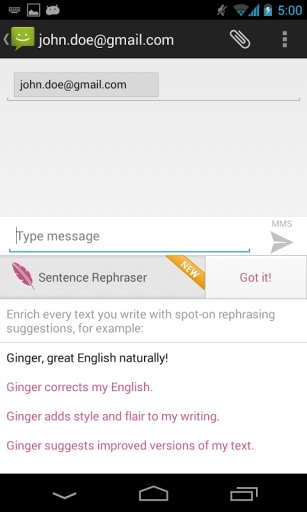所有其它键盘都没有的功能!试着写下‘He wants his teddy bare’ – 看看会发生什么!Ginger键盘是知道如何快速、有效地纠正您的语法、拼写和标点的键盘。有最好的英语语法校正员在您背后 – 您只须全神贯注打字即可。