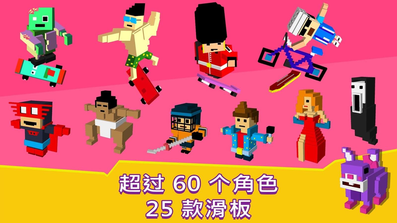 畅玩超过60个不同的趣味角色,各自拥有不同的服装与风格,并透过他们的滑板方式影响周遭的滑冰环境