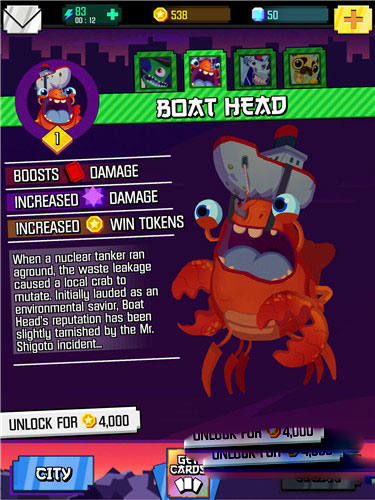 2、每一个怪兽都有其特殊的技能,使用这些技能来增加破坏力从而获得更多的金币;