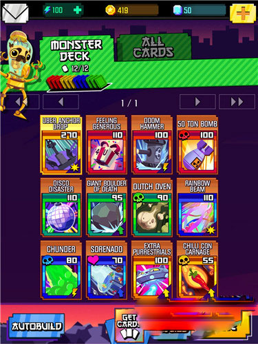 游戏中的卡牌可以搭配出各种不同的效果,还会产生各种炫酷的攻击特效,例如巨大锤子的轰击和发射出七彩激光等等。此外卡牌还会造成中毒效果和暴击,输出成吨的伤害。