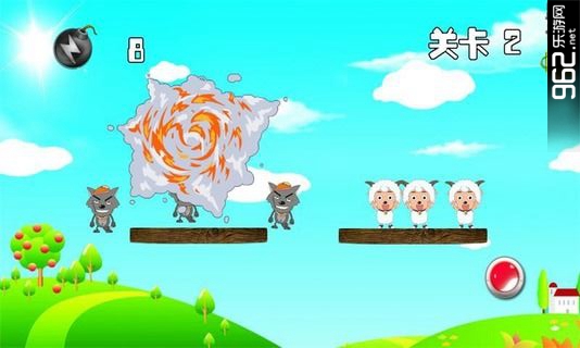 游戏的操作就是把炸弹安放到合适的位置,然后按下右下方的按钮来引爆炸弹,把灰太狼一次性全部炸飞就是完美过关,完美过关才能增加一枚炮弹的数量,初始炮弹数就9枚,看大家能闯到多少关吧。